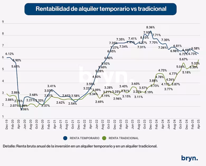 La consecuencia de esto es una caída en la rentabilidad del mercado de alquiler a corto plazo en plataformas. Si en 2023 el alquiler temporario llegó a ser hasta 2,5 veces más rentable que el tradicional, hoy los rendimientos de ambos formatos son similares. Con el agregado, además, de que la inversión en un alquiler tipo Airbnb requiere equipamiento y muchos costos fijos de mantenimiento por parte del propietario.